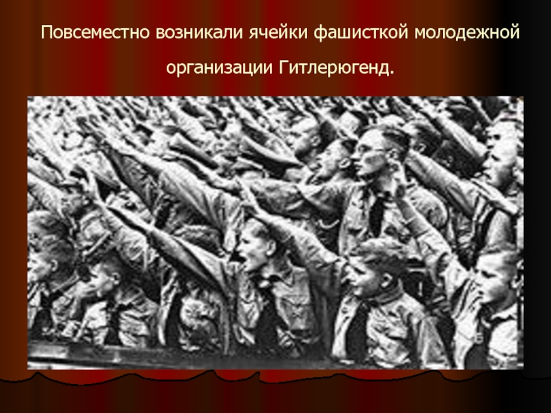 Слайд 8Повсеместно возникали ячейки фашисткой молодежной организации Гитлерюгенд.