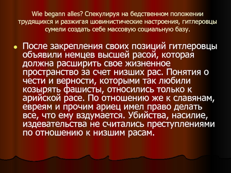 Слайд 7Wie begann alles? Спекулируя на бедственном положении трудящихся и разжигая шовинистические