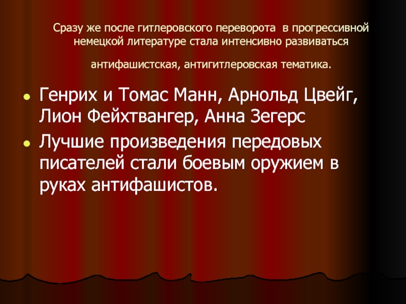 Слайд 12Сразу же после гитлеровского переворота в прогрессивной немецкой литературе стала интенсивно