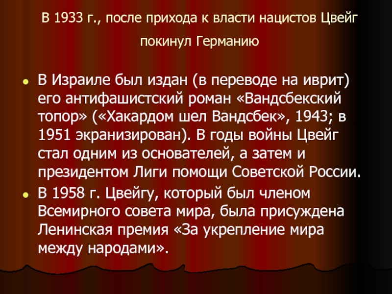 Слайд 25В 1933 г., после прихода к власти нацистов Цвейг покинул Германию
