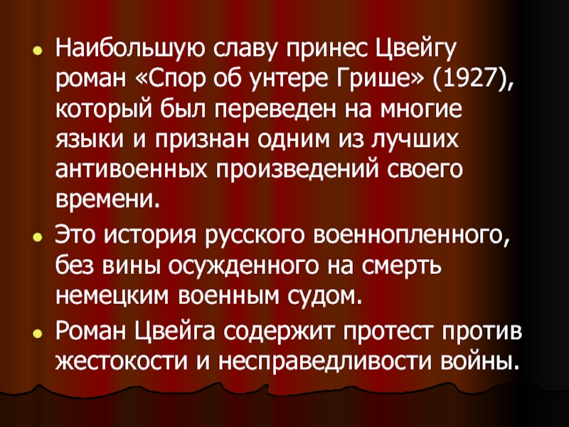 Слайд 26Наибольшую славу принес Цвейгу роман «Спор об унтере Грише» (1927), который