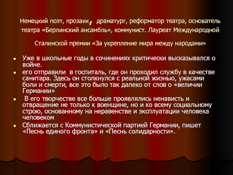 Слайд 32Немецкий поэт, прозаик, драматург, реформатор театра, основатель театра «Берлинский ансамбль», коммунист.