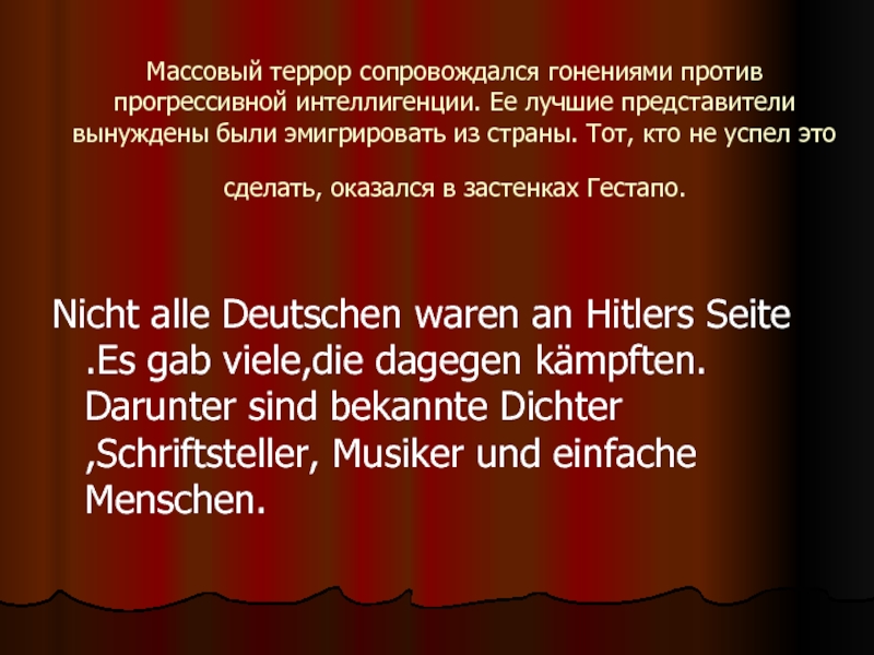 Слайд 14Массовый террор сопровождался гонениями против прогрессивной интеллигенции. Ее лучшие представители вынуждены
