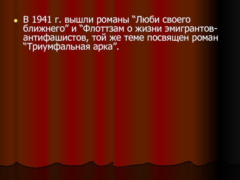 жизни эмигрантов-антифашистов, той же теме посвящен роман “Триумфальная арка”.