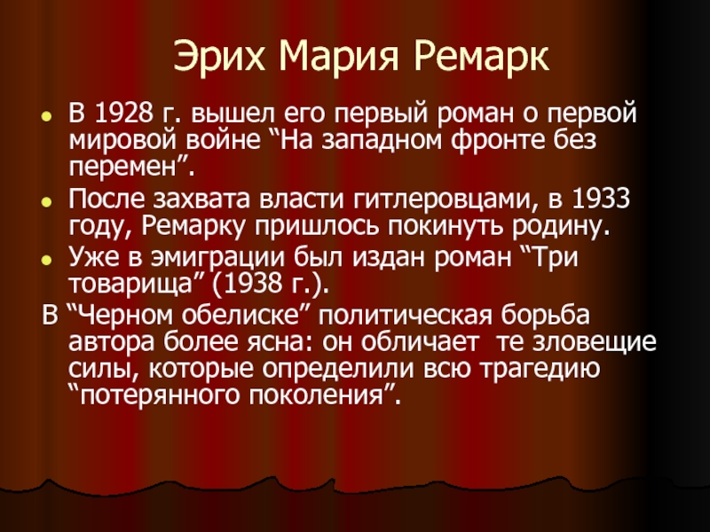 В “Черном обелиске” политическая борьба автора более ясна: он обличает те зловещие силы, которые определили всю трагедию “потерянного поколения”.