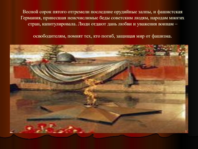 неисчислимые беды советским людям, народам многих стран, капитулировала. Люди отдают дань любви и уважения воинам – освободителям, помнят тех, кто погиб, защищая мир от фашизма.