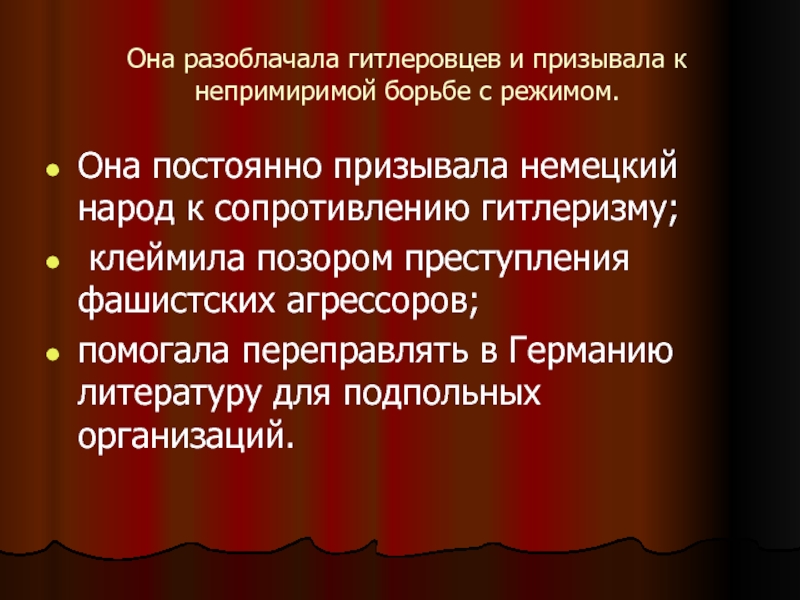 Слайд 15Она разоблачала гитлеровцев и призывала к непримиримой борьбе с режимом.