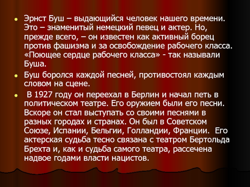 певец и актер. Но, прежде всего, – он известен как активный борец против фашизма и за освобождение рабочего класса. «Поющее сердце рабочего класса» - так называли Буша.