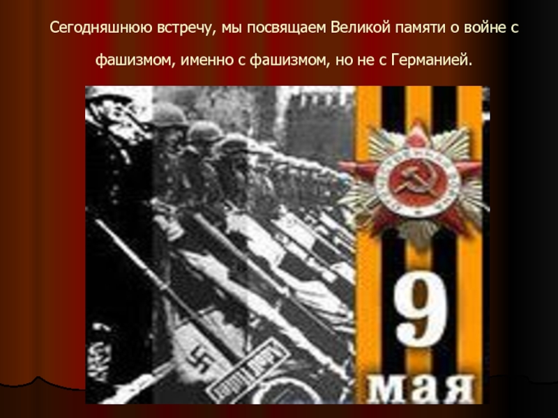Слайд 6Сегодняшнюю встречу, мы посвящаем Великой памяти о войне с фашизмом, именно