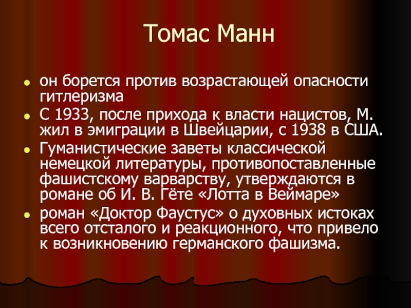 роман «Доктор Фаустус» о духовных истоках всего отсталого и реакционного, что привело к возникновению германского фашизма.