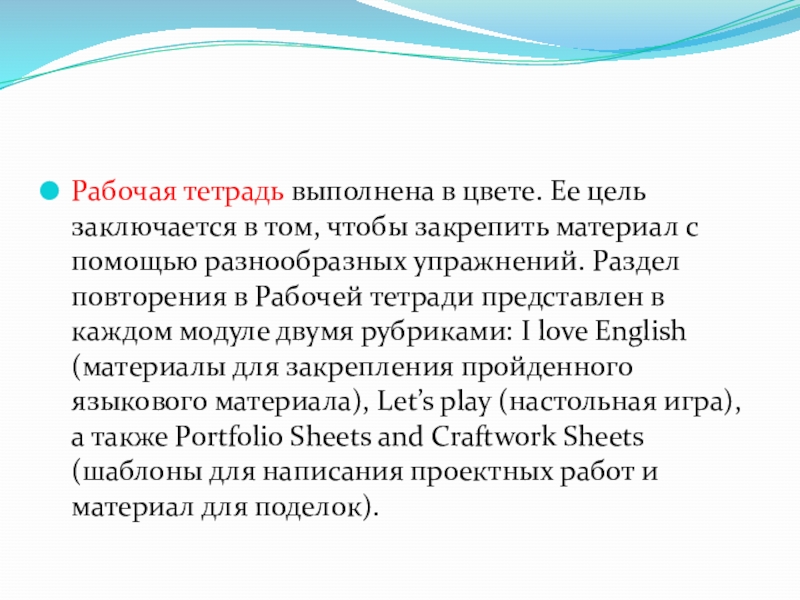 закрепить материал с помощью разнообразных упражнений. Раздел повторения в Рабочей тетради представлен в каждом модуле двумя рубриками: I love English (материалы для закрепления пройденного языкового материала), Let’s play (настольная игра), а также Portfolio Sheets and Craftwork Sheets (шаблоны для написания проектных работ и материал для поделок).