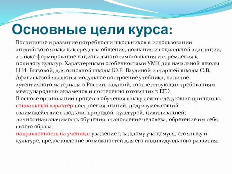 как средства общения, познания и социальной адаптации, а также формирование национального самосознания и стремления к полилогу культур. Характерными особенностями УМК для начальной школы Н.И. Быковой, для основной школы Ю.Е. Ваулиной и старшей школы О.В. Афанасьевой являются модульное построение учебника, наличие аутентичного материала о России, заданий, соответствующих требованиям международных экзаменов и постепенно готовящих к ЕГЭ.