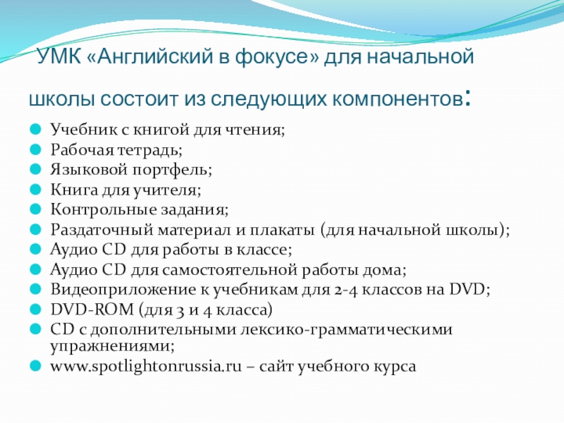 Ни один российский УМК не может похвастаться таким разнообразием составляющих его компонентов, которые позволяли бы достигать учителю положительных результатов в обучении младших школьников без излишнего их переутомления, помогали бы учащимся эффективно использовать английский язык и давали бы им возможность изучать его с удовольствием.