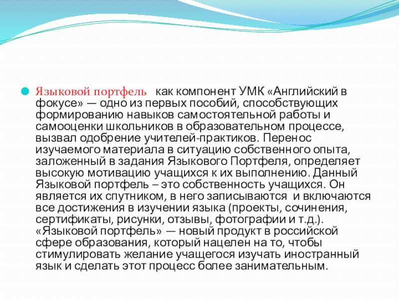 из первых пособий, способствующих формированию навыков самостоятельной работы и самооценки школьников в образовательном процессе, вызвал одобрение учителей-практиков. Перенос изучаемого материала в ситуацию собственного опыта, заложенный в задания Языкового Портфеля, определяет высокую мотивацию учащихся к их выполнению. Данный Языковой портфель – это собственность учащихся. Он является их спутником, в него записываются и включаются все достижения в изучении языка (проекты, сочинения, сертификаты, рисунки, отзывы, фотографии и т.д.). «Языковой портфель» — новый продукт в российской сфере образования, который нацелен на то, чтобы стимулировать желание учащегося изучать иностранный язык и сделать этот процесс более занимательным.