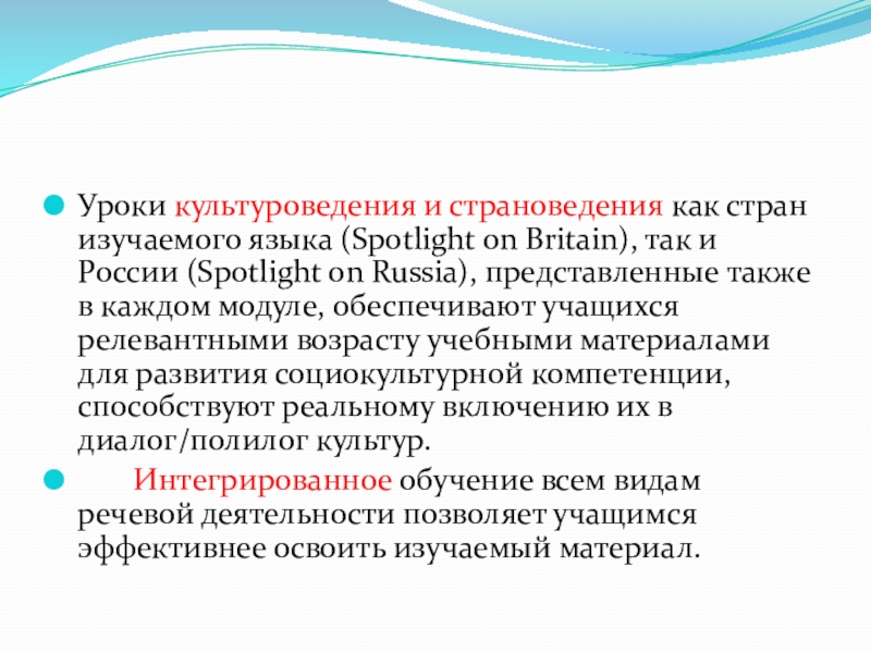 так и России (Spotlight on Russia), представленные также в каждом модуле, обеспечивают учащихся релевантными возрасту учебными материалами для развития социокультурной компетенции, способствуют реальному включению их в диалог/полилог культур.