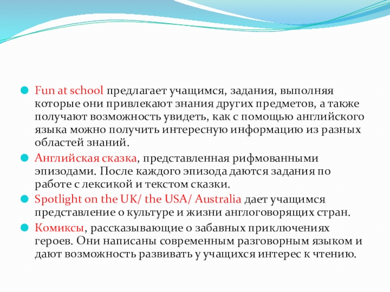 Слайд 11Fun at school предлагает учащимся, задания, выполняя которые они привлекают знания