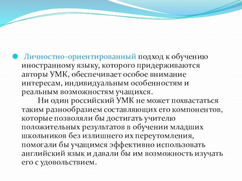 Слайд 8 Личностно-ориентированный подход к обучению иностранному языку, которого придерживаются авторы УМК, обеспечивает