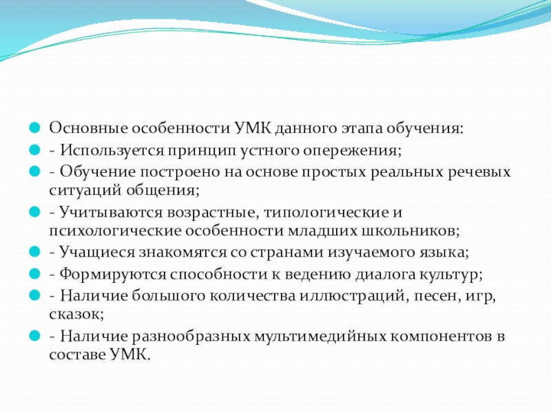 Слайд 6Основные особенности УМК данного этапа обучения: