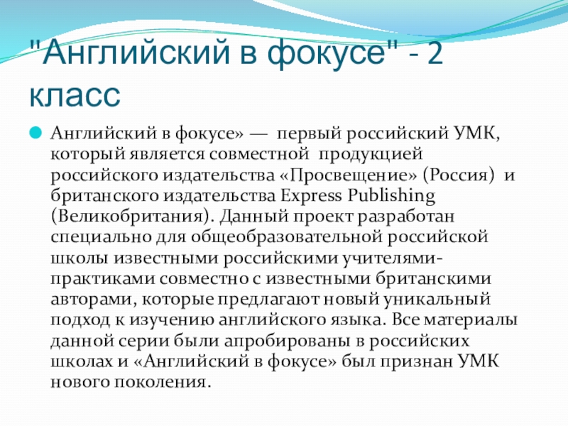 УМК, который является совместной продукцией российского издательства «Просвещение» (Россия) и британского издательства Express Publishing (Великобритания). Данный проект разработан специально для общеобразовательной российской школы известными российскими учителями-практиками совместно с известными британскими авторами, которые предлагают новый уникальный подход к изучению английского языка. Все материалы данной серии были апробированы в российских школах и «Английский в фокусе» был признан УМК нового поколения.