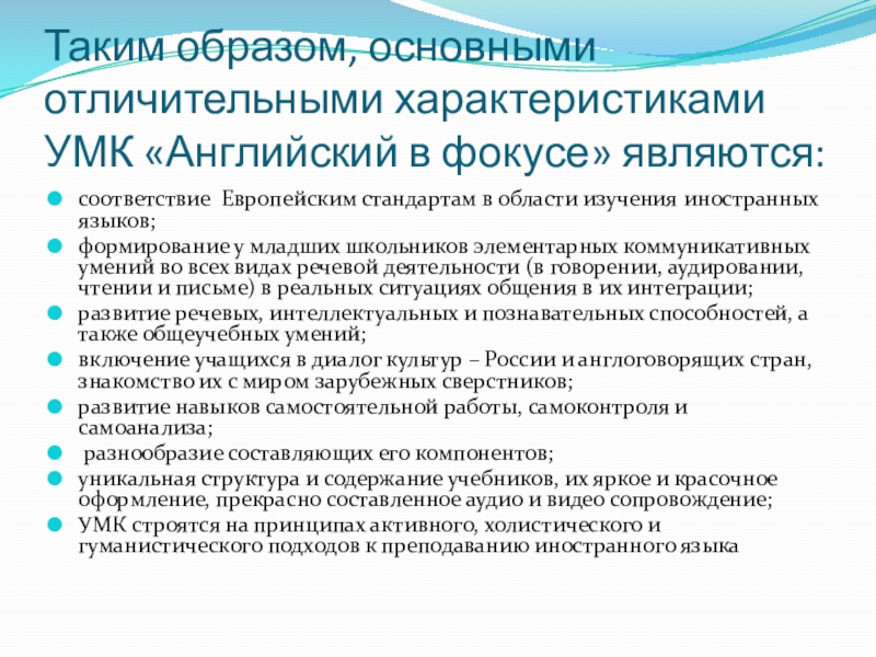 Слайд 17Таким образом, основными отличительными характеристиками УМК «Английский в фокусе» являются: