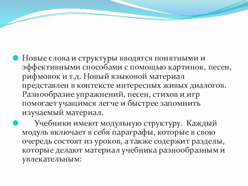 Слайд 10Новые слова и структуры вводятся понятными и эффективными способами с помощью