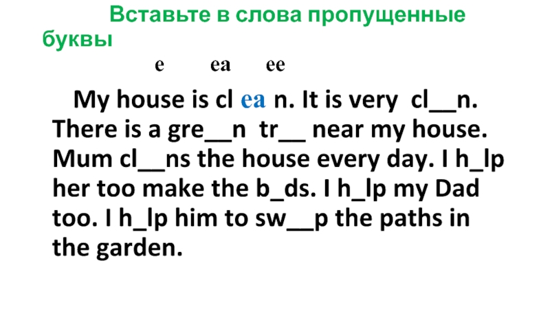 My house is cl ea n. It is very cl__n. There is a gre__n tr__ near my house. Mum cl__ns the house every day. I h_lp her too make the b_ds. I h_lp my Dad too. I h_lp him to sw__p the paths in the garden.