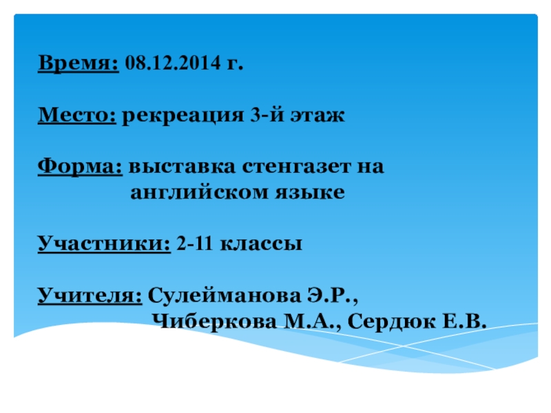 Место: рекреация 3-й этаж Форма: выставка стенгазет на английском языке Участники: 2-11 классы Учителя: Сулейманова Э.Р., Чиберкова М.А., Сердюк Е.В.