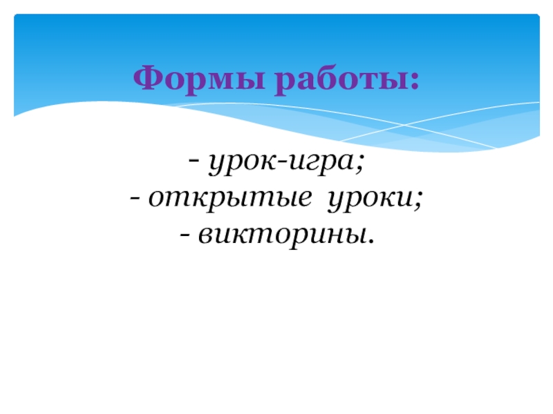Слайд 7Формы работы: - урок-игра; - открытые уроки; - викторины.