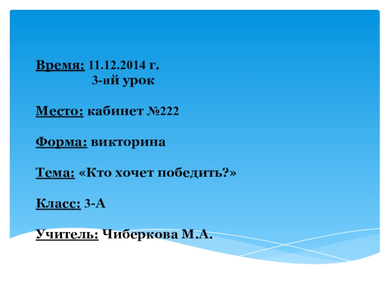 3-ий урок Место: кабинет №222 Форма: викторина Тема: «Кто хочет победить?» Класс: 3-А Учитель: Чиберкова М.А.