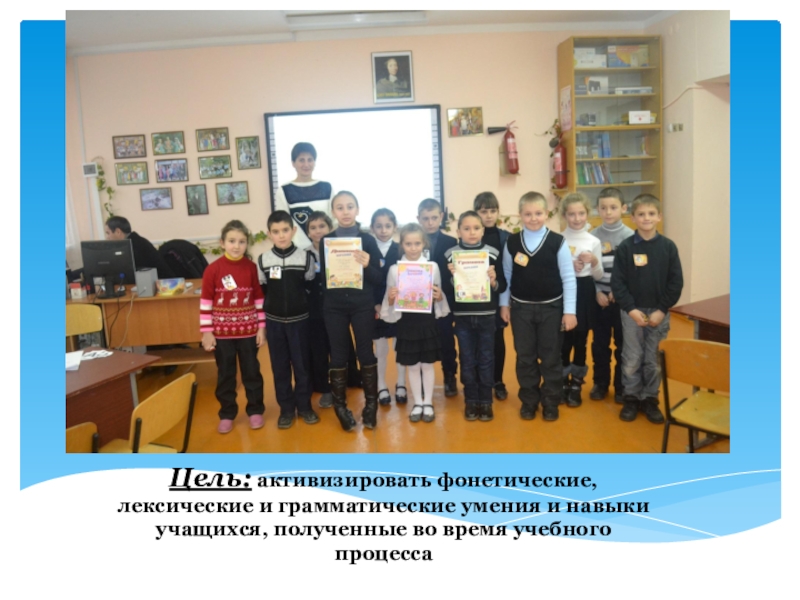 Слайд 27Цель: активизировать фонетические, лексические и грамматические умения и навыки учащихся, полученные
