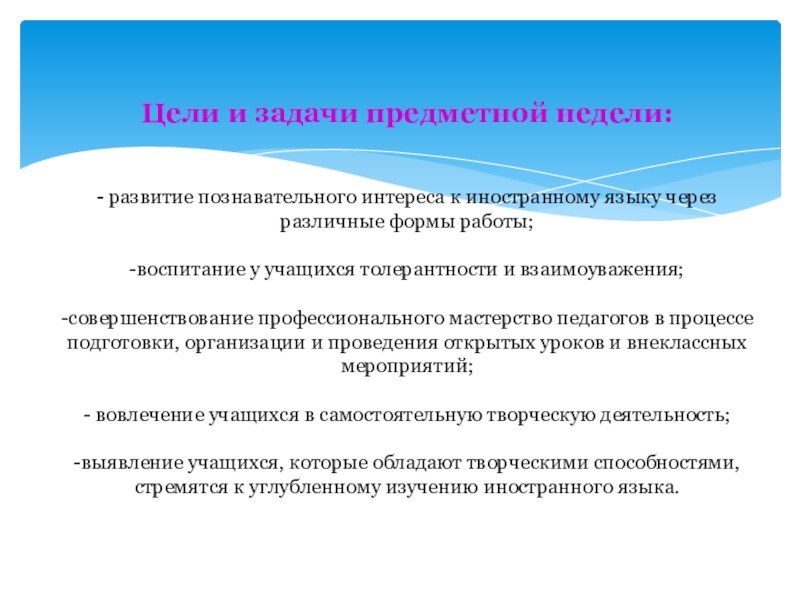 через различные формы работы;   -воспитание у учащихся толерантности и взаимоуважения;   -совершенствование профессионального мастерство педагогов в процессе подготовки, организации и проведения открытых уроков и внеклассных мероприятий;   - вовлечение учащихся в самостоятельную творческую деятельность;   -выявление учащихся, которые обладают творческими способностями, стремятся к углубленному изучению иностранного языка.