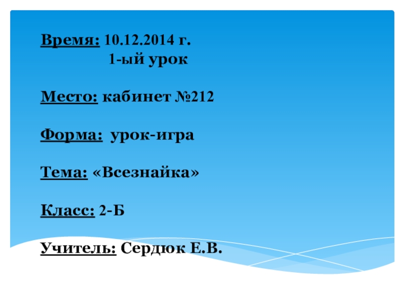 1-ый урок Место: кабинет №212 Форма: урок-игра Тема: «Всезнайка» Класс: 2-Б Учитель: Сердюк Е.В.