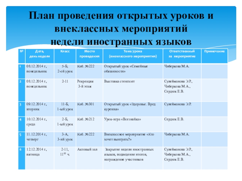 Слайд 8 План проведения открытых уроков и внеклассных мероприятий