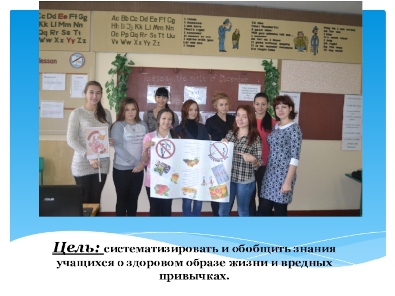 Слайд 17Цель: систематизировать и обобщить знания учащихся о здоровом образе жизни и