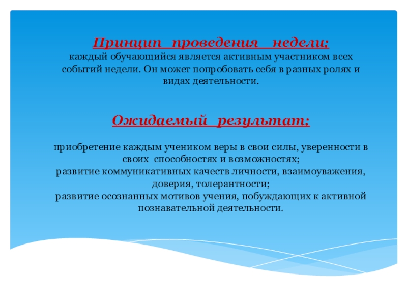 всех событий недели. Он может попробовать себя в разных ролях и видах деятельности.     Ожидаемый результат: приобретение каждым учеником веры в свои силы, уверенности в своих способностях и возможностях; развитие коммуникативных качеств личности, взаимоуважения, доверия, толерантности; развитие осознанных мотивов учения, побуждающих к активной познавательной деятельности.