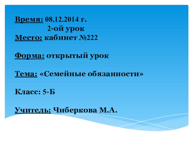 2-ой урок Место: кабинет №222 Форма: открытый урок Тема: «Семейные обязанности» Класс: 5-Б Учитель: Чиберкова М.А.