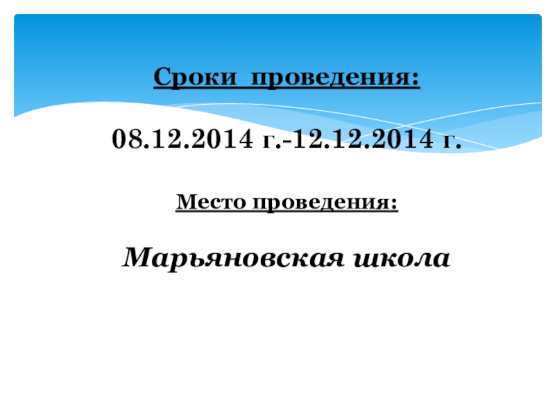 Слайд 4Сроки проведения: 08.12.2014 г.-12.12.2014 г. Место проведения: Марьяновская школа