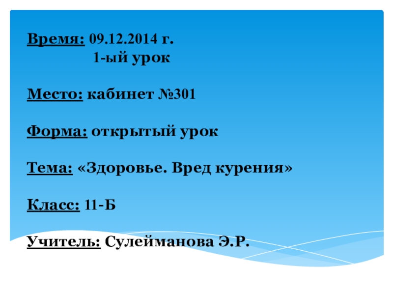 1-ый урок Место: кабинет №301 Форма: открытый урок Тема: «Здоровье. Вред курения» Класс: 11-Б Учитель: Сулейманова Э.Р.
