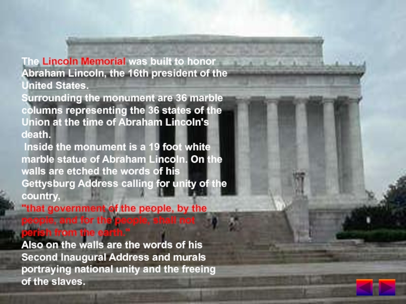 Inside the monument is a 19 foot white marble statue of Abraham Lincoln. On the walls are etched the words of his Gettysburg Address calling for unity of the country,