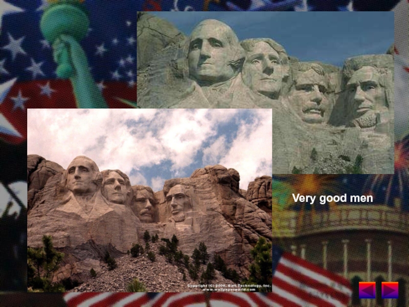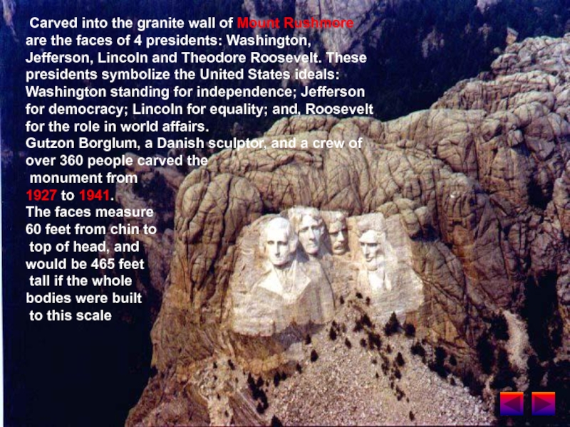 faces of 4 presidents: Washington, Jefferson, Lincoln and Theodore Roosevelt. These presidents symbolize the United States ideals: Washington standing for independence; Jefferson for democracy; Lincoln for equality; and, Roosevelt for the role in world affairs.