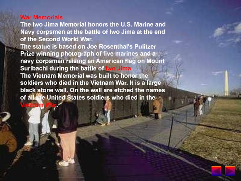 The Vietnam Memorial was built to honor the soldiers who died in the Vietnam War. It is a large black stone wall. On the wall are etched the names of all the United States soldiers who died in the Vietnam War.