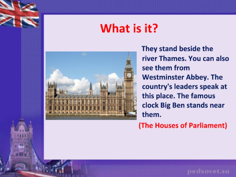 Британский Парламент: http://wallpaperscraft.ru/image/big_ben_london_vestminsterskij_dvorets_most_reka_temza_teplokhody_hdr_102637_800x600.jpg