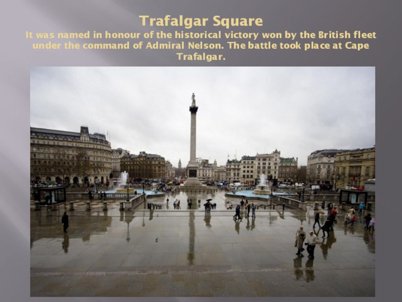 Слайд 13Trafalgar Square It was named in honour of the historical victory won