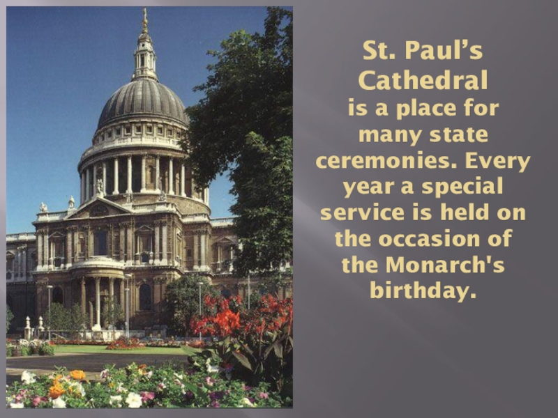 Слайд 14St. Paul’s Cathedral is a place for many state ceremonies. Every year