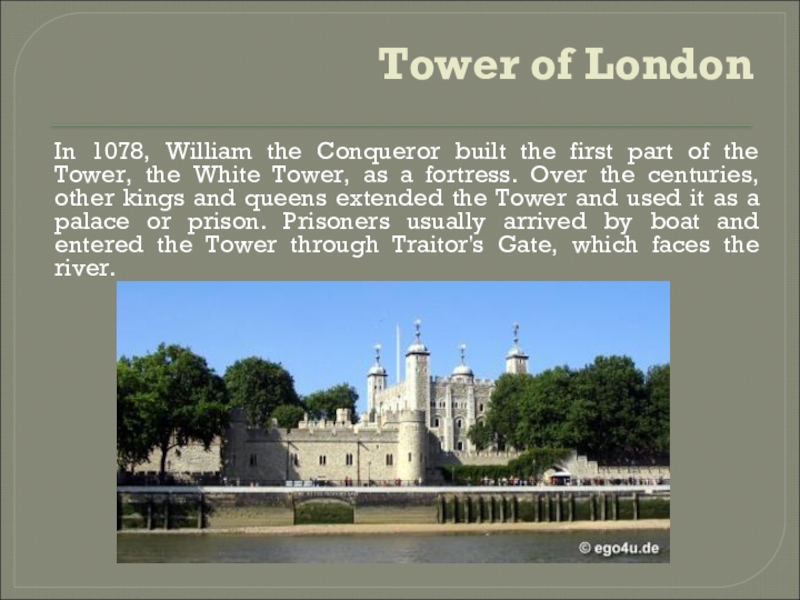 of the Tower, the White Tower, as a fortress. Over the centuries, other kings and queens extended the Tower and used it as a palace or prison. Prisoners usually arrived by boat and entered the Tower through Traitor's Gate, which faces the river.