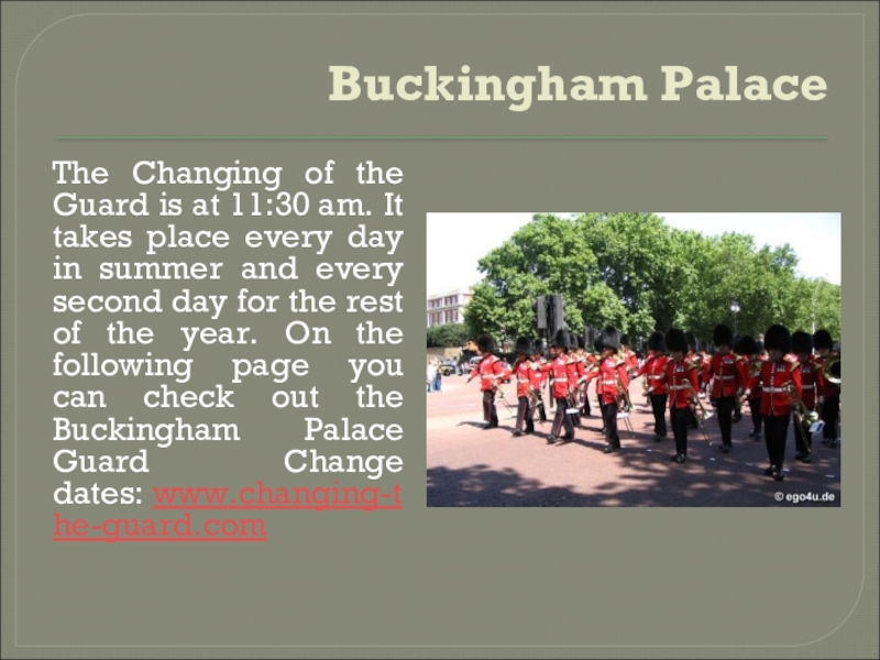 place every day in summer and every second day for the rest of the year. On the following page you can check out the Buckingham Palace Guard Change dates: www.changing-the-guard.com