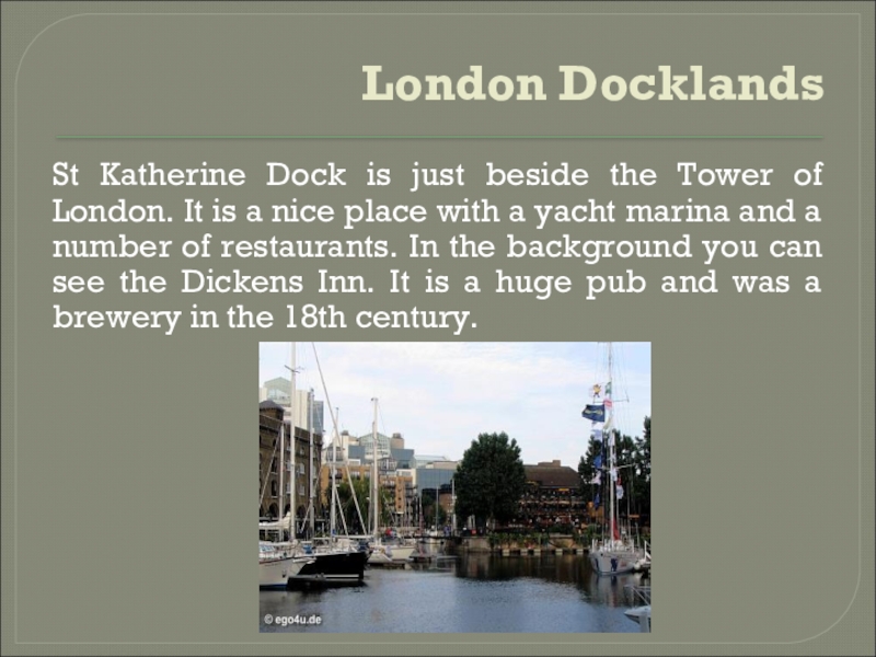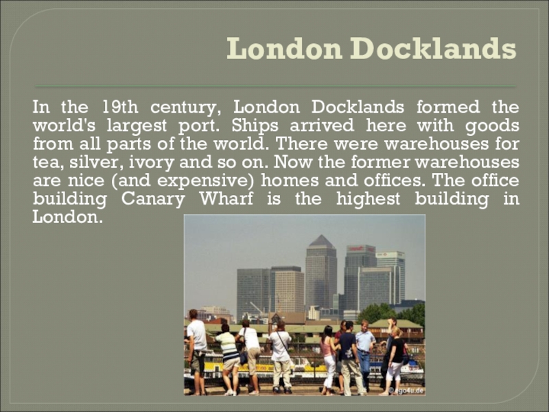 port. Ships arrived here with goods from all parts of the world. There were warehouses for tea, silver, ivory and so on. Now the former warehouses are nice (and expensive) homes and offices. The office building Canary Wharf is the highest building in London.