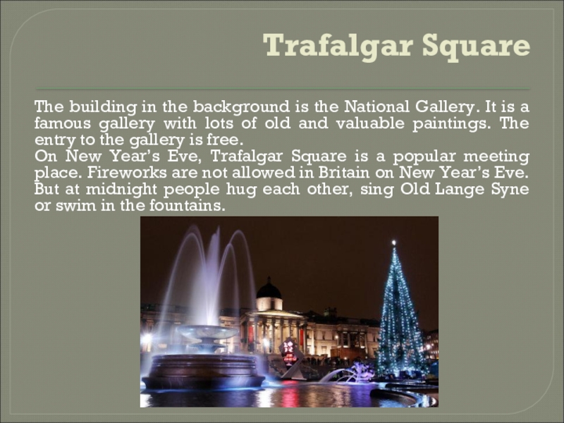 On New Year’s Eve, Trafalgar Square is a popular meeting place. Fireworks are not allowed in Britain on New Year’s Eve. But at midnight people hug each other, sing Old Lange Syne or swim in the fountains.