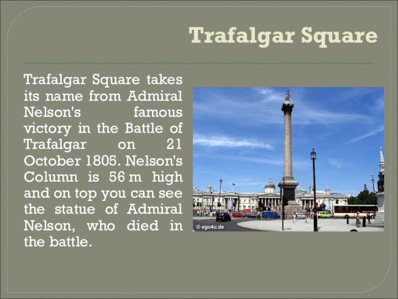 Trafalgar Square takes its name from Admiral Nelson's famous victory