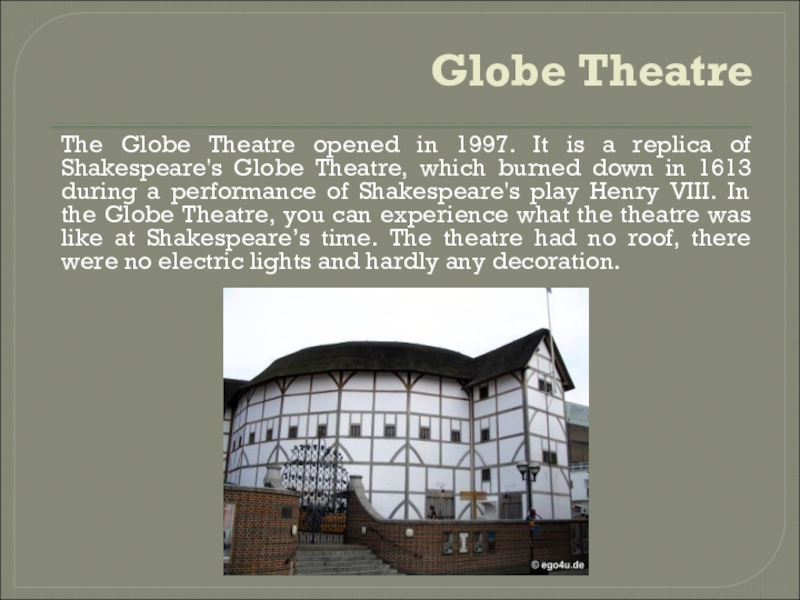 of Shakespeare's Globe Theatre, which burned down in 1613 during a performance of Shakespeare's play Henry VIII. In the Globe Theatre, you can experience what the theatre was like at Shakespeare’s time. The theatre had no roof, there were no electric lights and hardly any decoration.